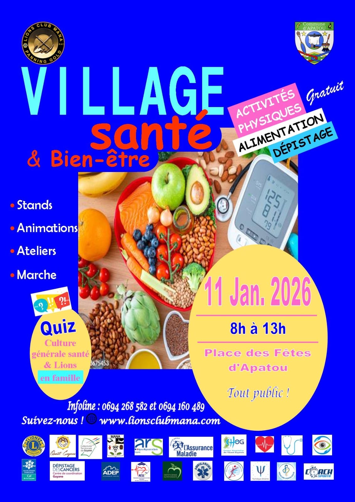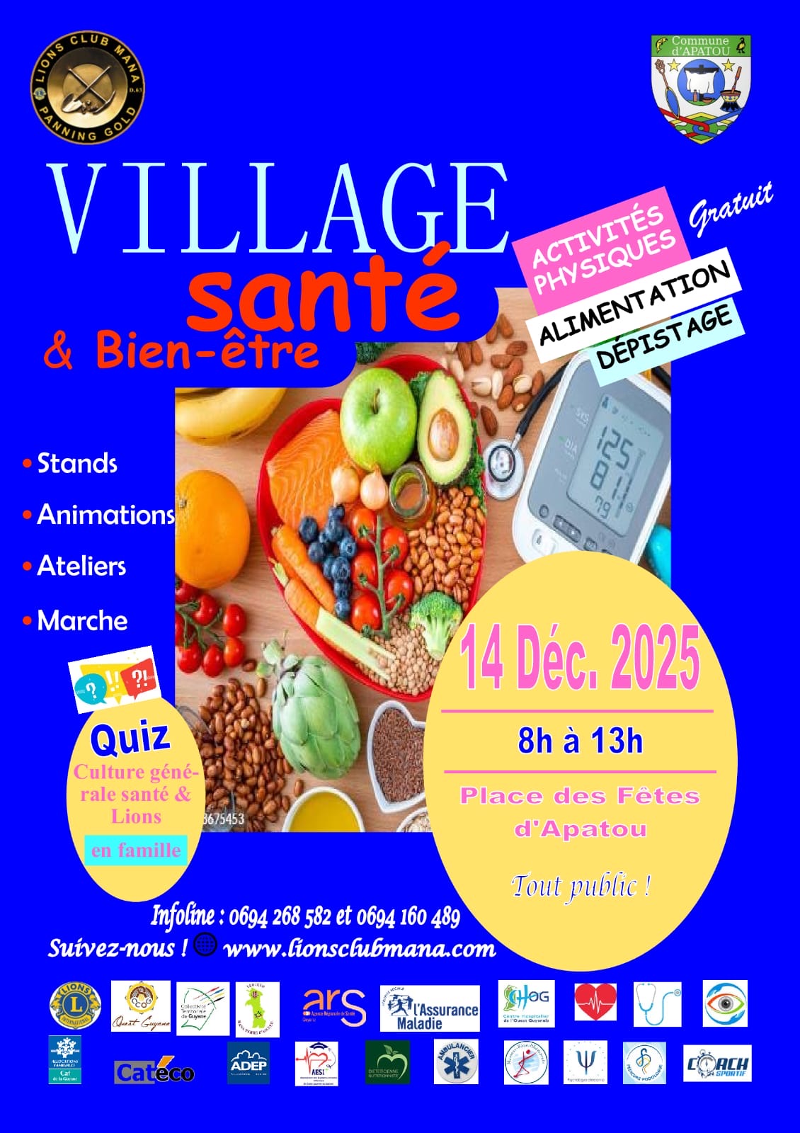 Apatou🩺🌿 Village Santé & Bien-être – Apatou Le Lions Club Mana Panning Gold, en partenariat avec la Commune d’Apatou, a le plaisir de vous inviter au Village Santé & Bien-être. 📅 Samedi 14 décembre 2025 ⏰ De 8h à 13h 📍 Place des Fêtes d’Apatou 🎟️ Entrée gratuite – Tout public Au programme : ✔️ […]
