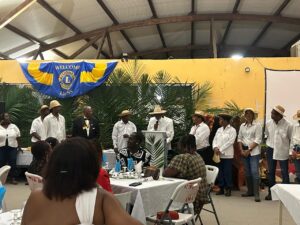Permettez-moi de revenir sur un détail important de cette soirée : la tenue vestimentaire que nous avons choisie pour l’occasion. Le spectacle que nous vous avons présenté avait pour but de symboliser l’emblème de notre club. Vous avez pu observer nos tenues de chercheurs d’or et leurs outils, illustrant ainsi notre quête de valeurs et d’idéal. L’objectif était de mettre en avant notre « grosse pépite », représentant la jeunesse, et de célébrer, à travers ce spectacle, la renaissance du Leo Club Mana Terre d’Accueil, qui réintègre fièrement notre Lions Club Mana Panning Gold.